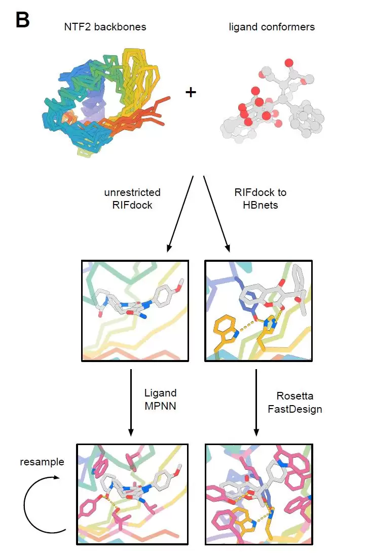 方法一(RIFdock to HBNets):将前五种小分子对接到第一批骨架库中,并强制要求至少存在一个由预计算氢键网络(HBNet)介导的相互作用,随后用基于天然序列信息的Rosetta设计进行优化。