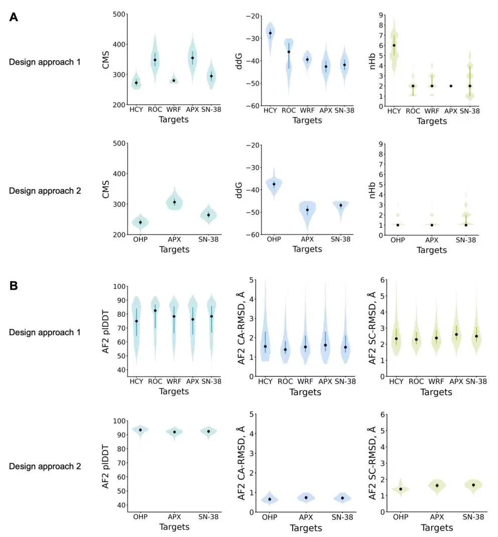 筛选环节同样严谨。研究人员计算了蛋白质-配体间的氢键数量、结合自由能变化和接触表面积。对于第二种方法的设计,还结合了单序列AlphaFold的预测结果,筛选那些既能准确折叠又能形成预期结合位点的设计(评估指标见下图)。