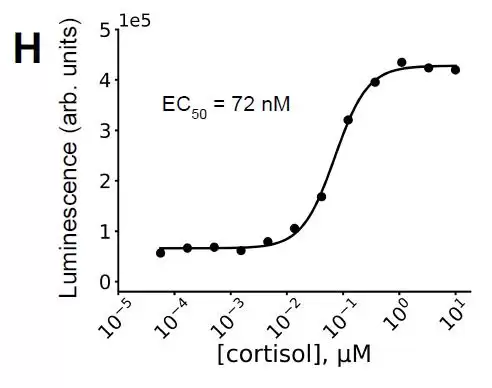 最后,将这个体系与NanoBiT荧光素酶报告系统融合。实验表明,该传感器仅在皮质醇存在时才会产生强烈的发光信号,其半最大效应浓度(EC50)约为72 nM(下图H),与测得的结合亲和力一致,且在没有皮质醇时背景信号很低。这成功验证了将设计蛋白转化为功能性生物传感器的可行性。