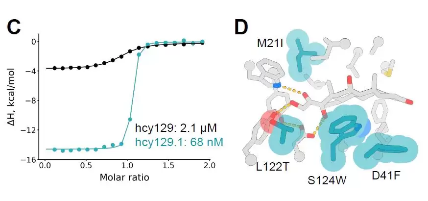 最佳变体hcy129.1的解离常数(KD)达到68 nM,比原始设计提高了31倍(下图C)。结构分析表明,亲和力的增强主要源于与皮质醇之间更强的疏水相互作用(下图D)。