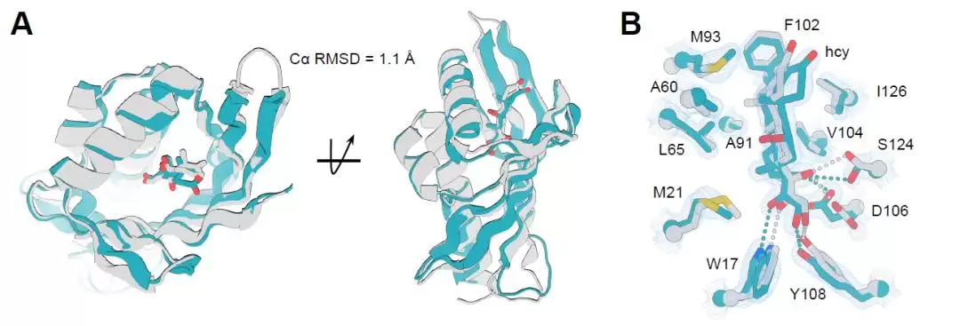 其中,hcy129与皮质醇复合物的分辨率高达1.5 Å。结构比对显示,其整体折叠与计算机设计模型高度一致,关键氢键残基和配体构象也完美匹配(下图A,B)。这证明了预构建氢键网络策略的成功,实现了极性相互作用的精准“雕刻”。
