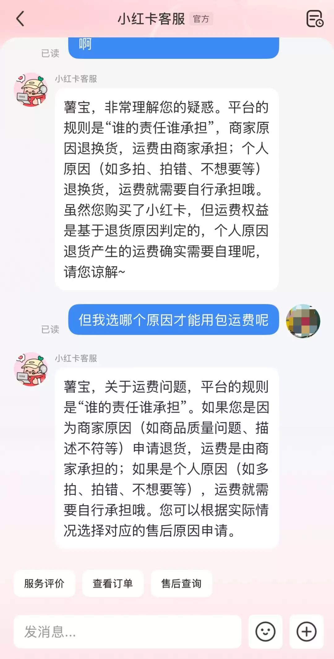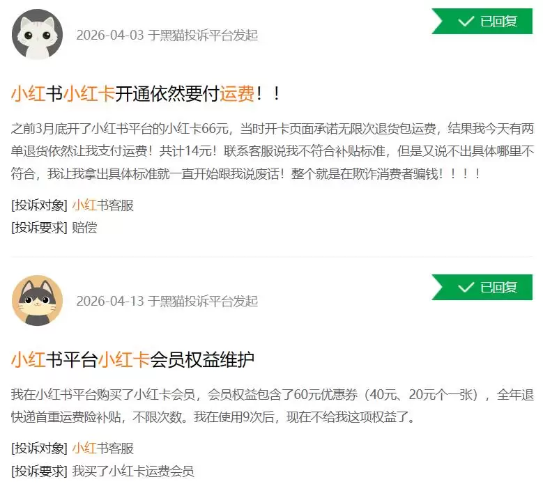 但理想和现实之间,仍有不小的距离。已有用户在新版小红卡开通后,在黑猫投诉平台反映,开卡页面承诺的“无限次退货包运费”,在实际退货时仍被要求支付运费,客服也无法给出具体的补贴标准。