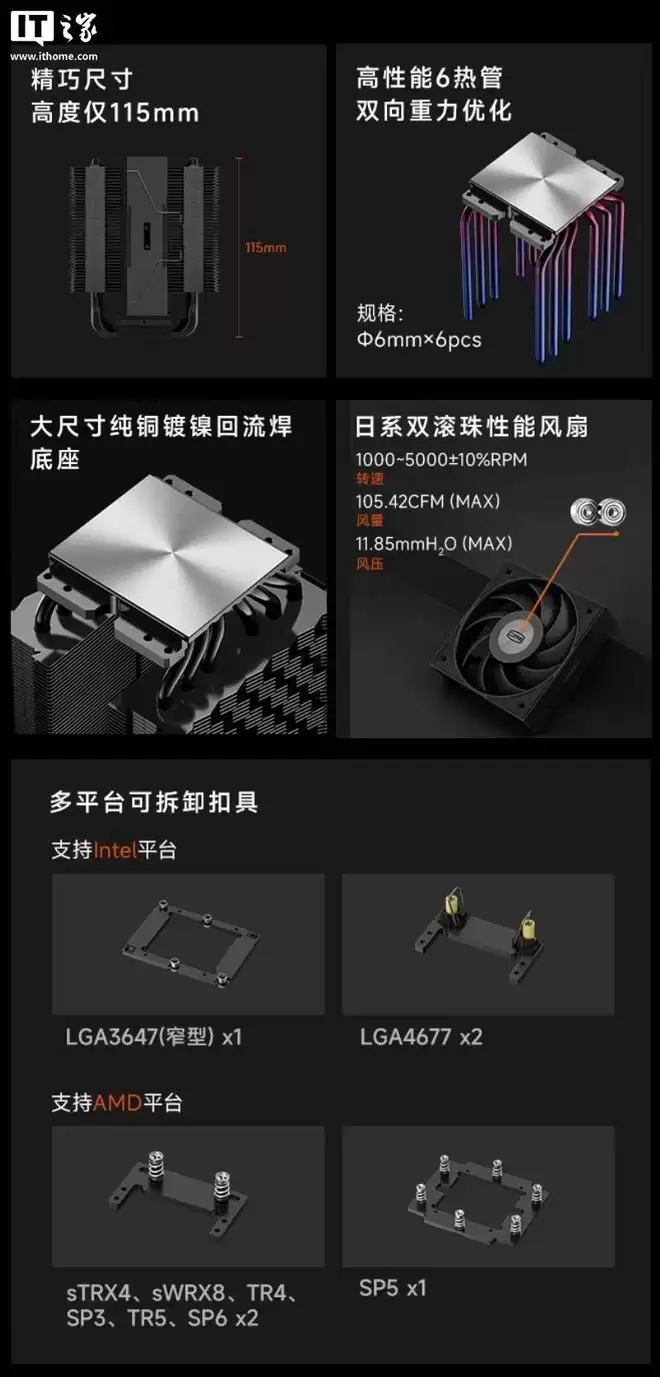 兼容性方面,它准备得相当充分。除了主流的消费级平台,它还兼容英特尔LGA3647(窄型)/4677以及AMD的sTRX4/sWRX8/TR4/SP3/TR5/SP5/SP6等平台,这意味着从高性能工作站到顶级线程撕裂者平台,它都有可能覆盖。