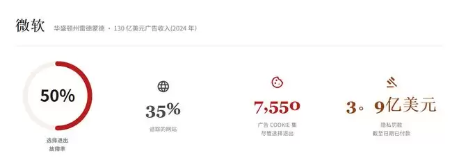 具体来看,微软的广告网络无视了大约一半的退出信号,仍在35%的客户网站上追踪用户,此举可能面临约3.9亿美元的罚款。