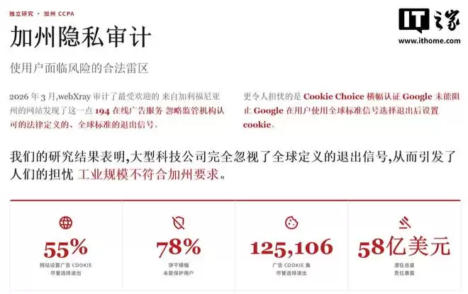 广告追踪的“合规成本”博弈:当拒绝信号沦为摆设 加州审计机构webXray近期发布的一份报告,揭开了数字广告行业一个公开的秘密:面对用户的拒绝,许多大型广告技术公司选择了“视而不见”。 这份于2026年3月出炉的审计结果,通过对加州用户的抽样调查,揭示了近200家广告服务商存在一个共同的操作——无视