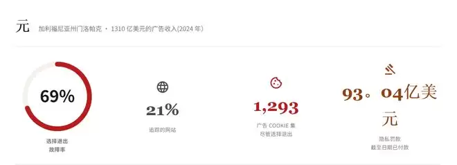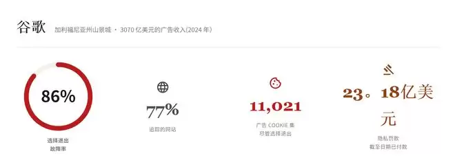 谷歌的相关数据则更高,其网络无视了86%的退出请求,在77%的网站上保持了活跃追踪,预计罚款金额可能攀升至23.1亿美元。