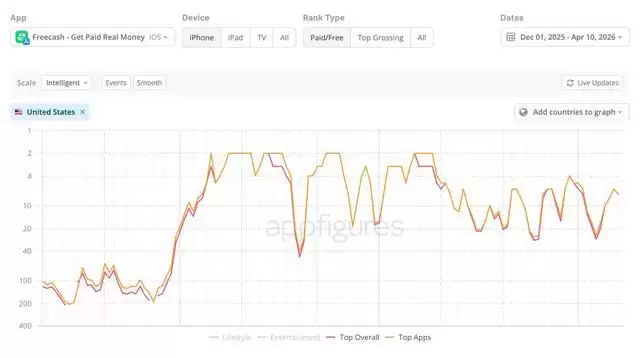 数据分析揭示了一个更令人担忧的事实:这款应用的影响力远超想象。仅在2026年1月,“Freecash”在苹果和谷歌两大平台上的总下载量就达到了550万次,并且此后一直在App Store排行榜中保持着较高排名。它是如何做到这一点的?除了在TikTok上投放夸大收益的广告外,调查发现,该应用似乎还动用了机器人账号和刷虚假评分等手段来人为推高热度和曝光度。更有迹象表明,开发团队可能采取了一种“金蝉脱壳”的策略:通过收购一个已在App Store上架的应用,然后将其更名为“Freecash”并更新功能,以此来规避其在2024年曾遭遇的一次下架封禁,以及后续可能更为严格的审核流程。