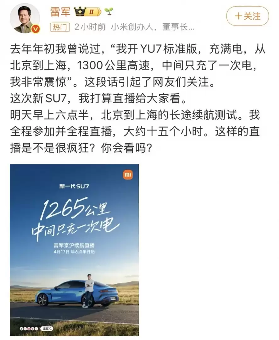 4月16日,小米创始人雷军通过社交平台宣布了一项引人注目的计划:第二天早上六点半,他将亲自直播新一代SU7从北京到上海的长途续航测试,整个过程预计将持续约15个小时。