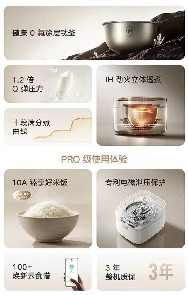 容量方面,4L的规格对于大多数家庭来说已经足够,官方数据称最多可盛装约16碗米饭。内胆的用料也值得一说,它采用了2.5mm厚度的“钛釜”,并声称使用了0氟涂层,这在耐用性和健康宣称上做了文章。