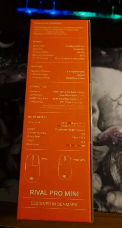 包装信息明确显示,Rival Pro Mini将支持UWB(超宽带)无线通信技术。这项技术的优势在于,它能实现极低延迟和超高带宽的数据传输,让鼠标在无线模式下支持高达8kHz的回报率。这意味着什么?简单来说,就是鼠标的移动信号传输更快、更稳定,能带来更跟手、更精准的操控体验,大幅缩减无线与有线鼠标之间的性能差距,为竞技玩家提供可靠保障。