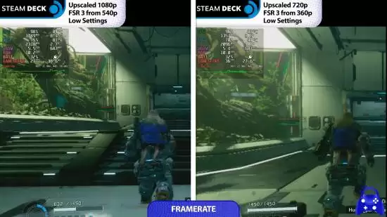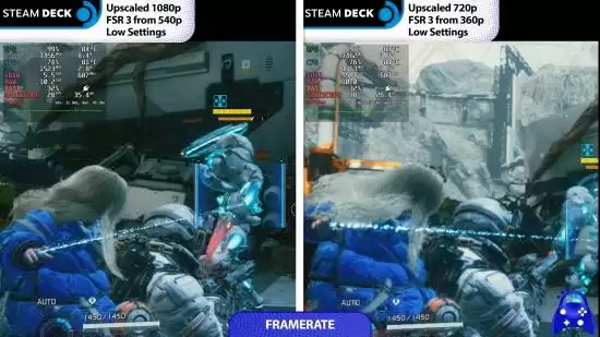 实测数据清晰揭示了性能差距。在底座模式下,Steam Deck 借助 FSR 3 超分辨率技术,将 540p 原生画面提升至 1080p 输出,但帧率表现仅为平均 30 FPS 左右,流畅度较为勉强。