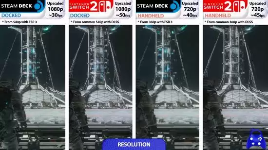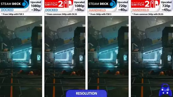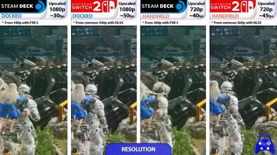 那么,在更常用的手持便携模式下,两者的表现如何?差距依然存在。Steam Deck 通过 FSR 3 从 360p 缩放至 720p,帧率提升至约 40 FPS;而 Switch 2 在相同分辨率缩放条件下,利用 DLSS 技术实现了平均 45 FPS 的帧率,继续保持领先。