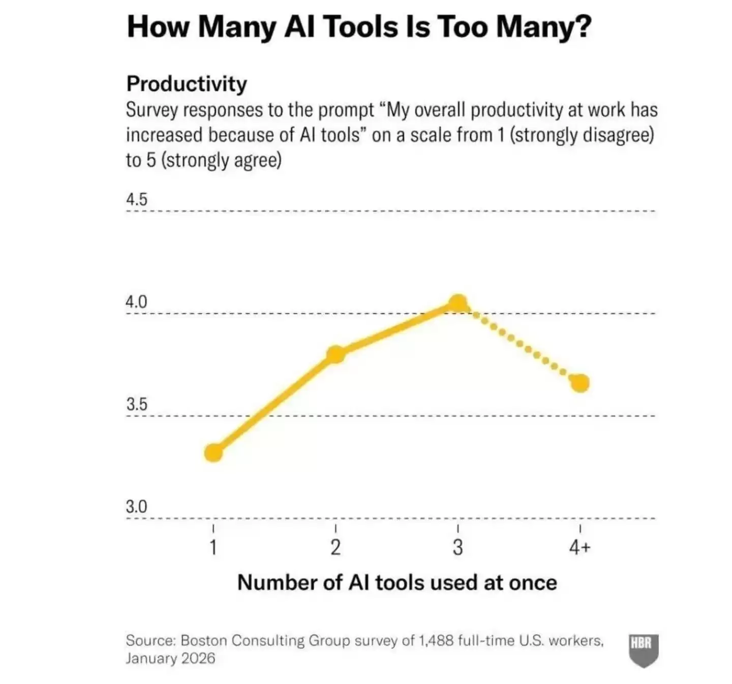 第三,使用更多AI工具并不等于更高生产力。研究发现,当员工从使用一种AI工具增加到三种时,生产力会显著提高;但当使用超过三种后,生产力评分反而下降。
