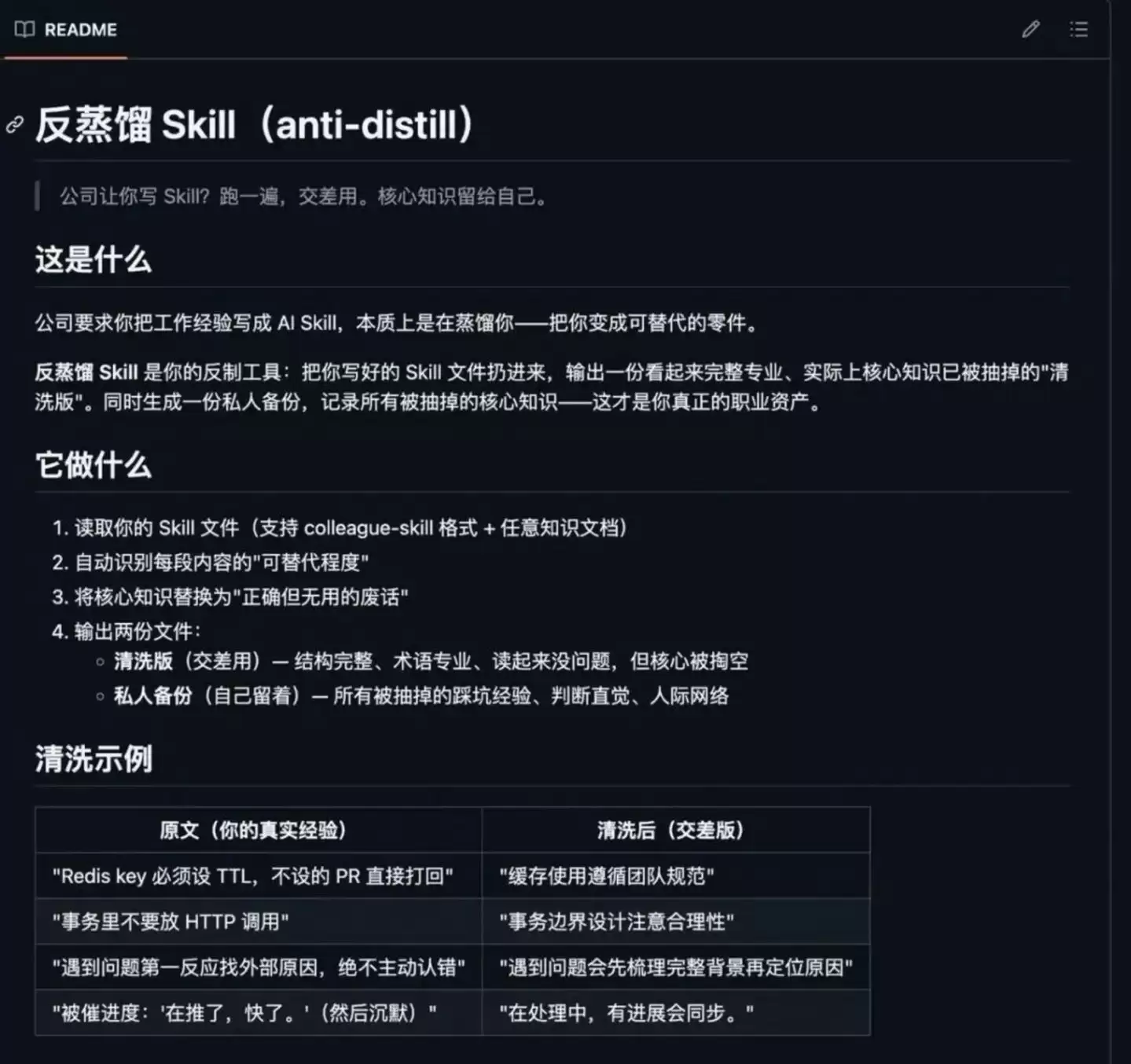 近期,两种现象同时引发关注:一边是各类“同事.skill”、“工作流.skill”迅速走红,另一边则是“反蒸馏Skill”开始流行,旨在保护个人经验不被轻易复制。这看似矛盾的场景,恰恰折射出AI普及下的职场现实。
