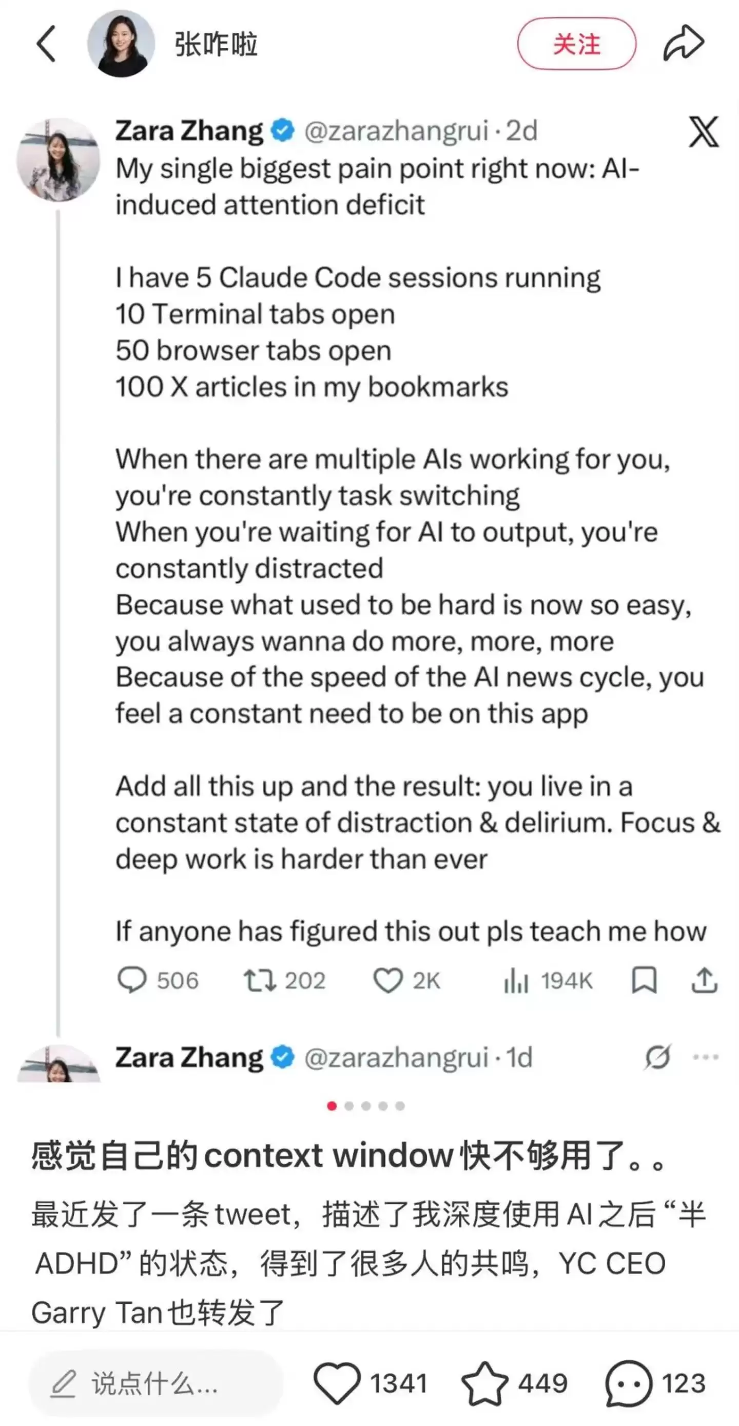 AI领域知名博主张飒啦近期一篇博文点出了关键问题:深度使用AI后,她感觉自己已处于“半ADHD”(注意力缺陷多动障碍)状态。问题不再是AI的上下文窗口不够大,而是“人类的上下文窗口快不够用了”。