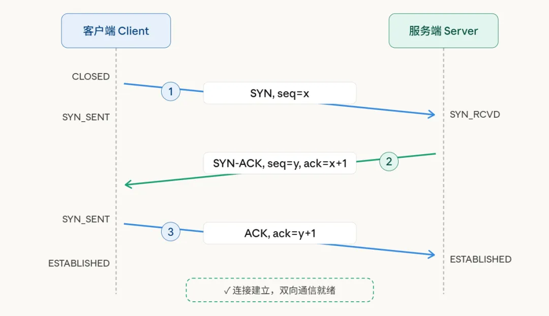 第三次握手:客户端收到服务端的SYN-ACK后,发出最后一个ACK包进行确认。这个ACK包送达后,双方才共同进入ESTABLISHED状态,连接至此正式建立,可以开始传输数据了。