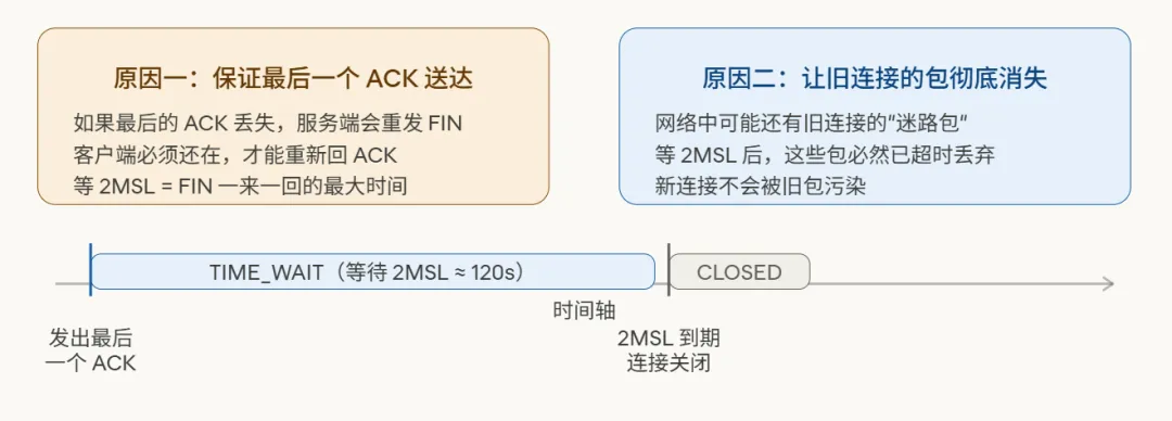 - TIME_WAIT状态,则是为了最后一个ACK的可靠交付,以及让旧连接的“幽灵”报文彻底消失,为新连接扫清道路。
