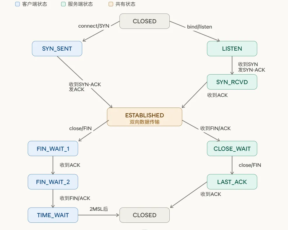 这张状态转换图值得仔细琢磨。图中清晰地展示了客户端(蓝色路径)和服务端(绿色路径)在连接生命周期中经历的不同状态。两条路径在ESTABLISHED汇合,共享数据传输的时光,又在关闭时于不同的步骤分道扬镳。理解这张图,TCP连接的生命周期就在你脑子里了。