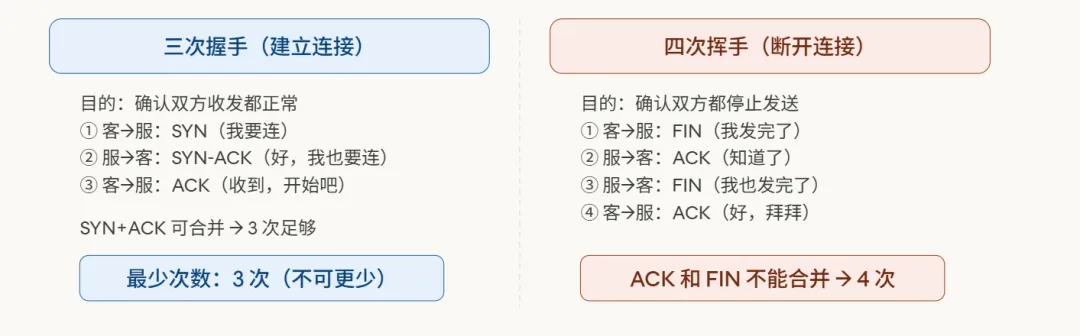 但关闭连接时,情况不同了。“我不再发送数据了”和“我也不再发送数据了”是两个独立的、可能不同步的事件。当客户端发送FIN表示要关闭自己这一侧的发送通道时,服务端可能还有数据没传完。所以,服务端必须先回一个ACK,确认收到了客户端的关闭请求,然后继续发送剩余数据。等所有数据都发送完毕后,服务端再发送自己的FIN,关闭自己这一侧的发送通道。正因为ACK和FIN不能像握手时那样同时发出,所以挥手过程自然就变成了四步。