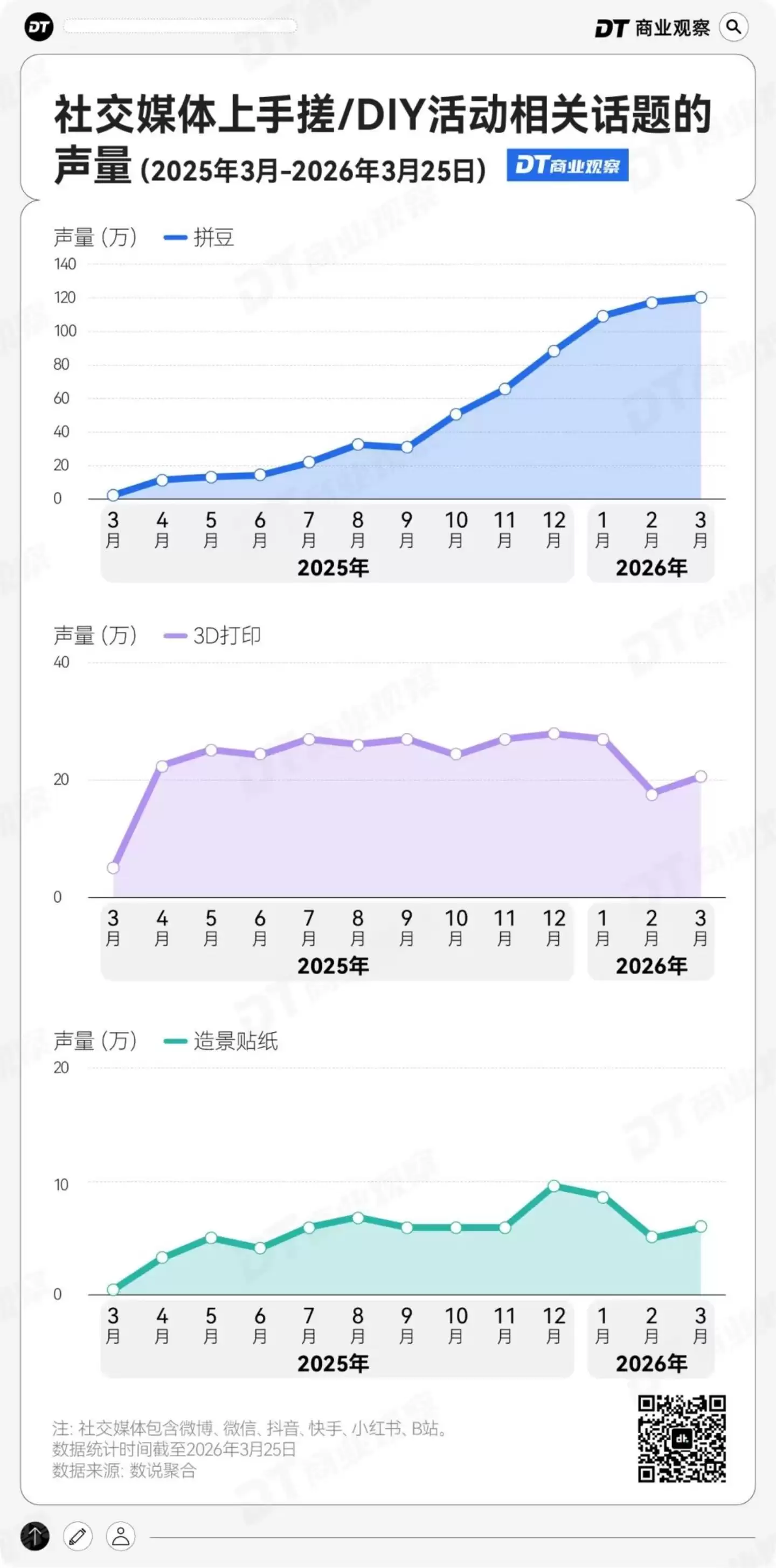 数据是最有力的证明。从2025年3月到2026年3月,拼豆在社交媒体上的讨论声量从2.1万激增至120.4万,一年内暴涨近60倍;3D打印的月均声量稳定在20万以上,用户基础相当稳固;而体量相对较小的造景贴纸,也在2025年底迎来了一波显著的关注度增长。