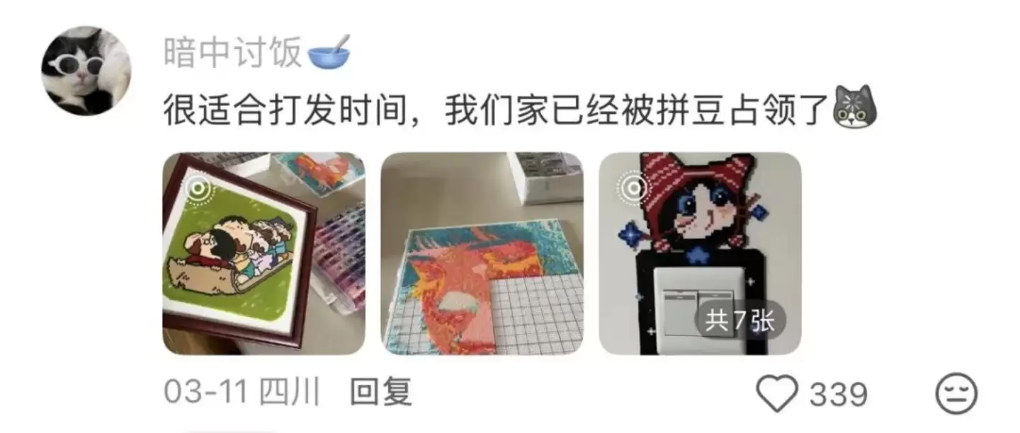 由于其成品是由一个个小方格组成的点阵画面,且制作过程同样上手简单、重复性强、极具解压效果,拼豆被广大玩家亲切地比喻为“一代人有一代人的十字绣”。