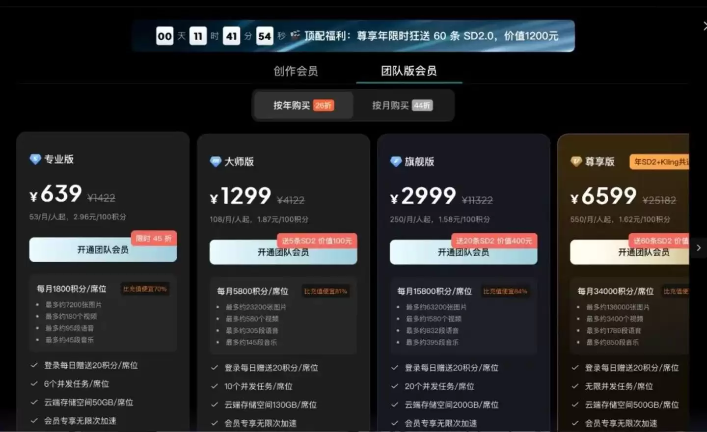 据了解,目前在LibTV上,购买会员即赠送Seedance 2.0使用额度,Kling模型可免费使用,最高可获得180条视频生成权益。对于重度用户,例如一些超创工作室和短剧公司,LibTV的性价比同样突出。例如其提供的Kling o3+3.0、libnano Pro、libnano 2等顶级模型专享包,价格比原厂渠道还要低约30%。