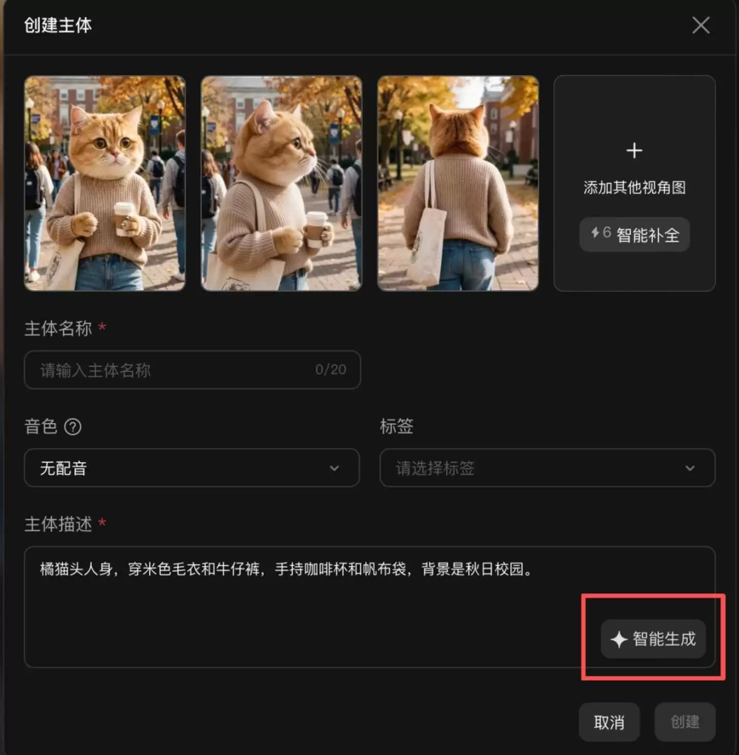 在主体库方面,音色上传现已支持视频格式,无需像过去那样先提取音频再上传;人物音色可以直接从历史资产库中选取。在主体描述上,也无需手动编辑,系统可直接智能生成描述文本。
