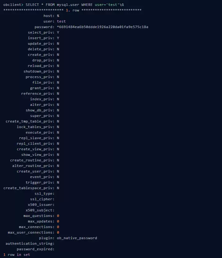 -- 查看test的全局权限详情SELECT * FROM mysql.user WHERE user=‘test’\G
