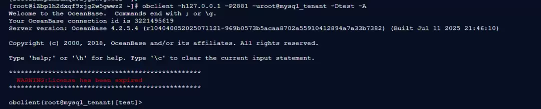 # 登录mysql_tenant 租户(密码替换为你设置的密码)obclient -h127.0.0.1 -P2881 -uroot@mysql_tenant -p‘123456’ -A