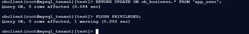 -- 回收app_user对ob_business库的修改权限REVOKE UPDATE ON ob_business.* FROM ‘app_user’;FLUSH PRIVILEGES;