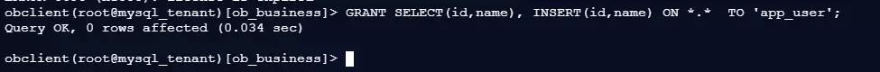-- 仅授予app_user对ob_business库下user表的查询权限GRANT SELECT ON ob_business.user TO ‘app_user’;