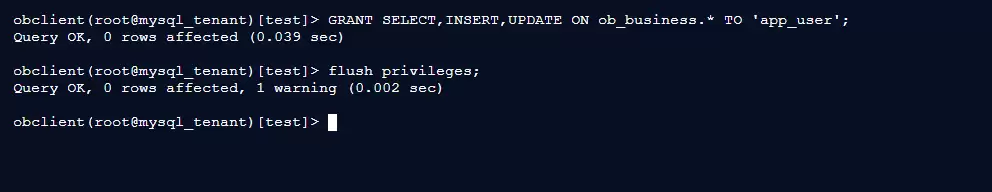 -- 授予app_user对ob_business库的 查/增/改 权限GRANT SELECT,INSERT,UPDATE ON ob_business.* TO ‘app_user’;-- 刷新权限,立即生效FLUSH PRIVILEGES;