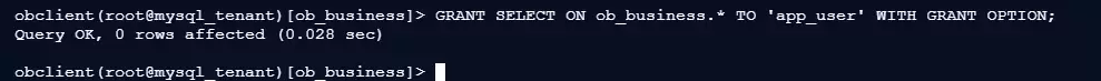 GRANT SELECT ON ob_business.* TO ‘app_user’ WITH GRANT OPTION;