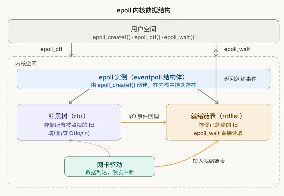右边那套红黑树 + 就绪链表的设计,就是 epoll 快的根本原因,下面展开讲。