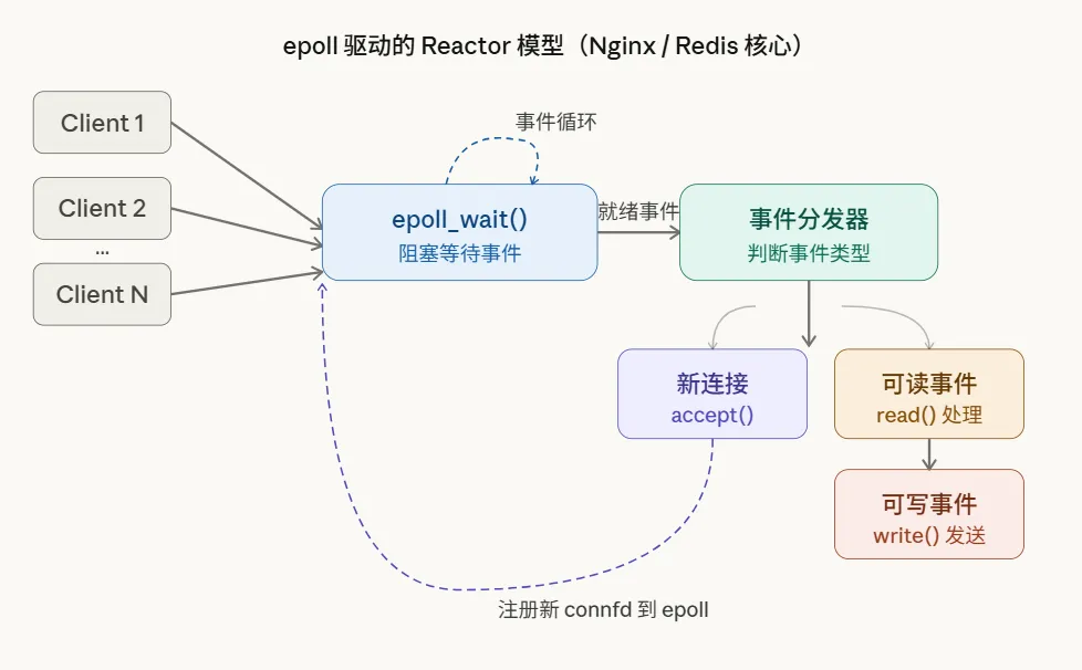 这就是现代高性能网络框架(如 Redis、Nginx)所采用的 Reactor 模式的核心骨架:一个事件循环(Event Loop)负责收集所有 I/O 事件,然后分发给对应的处理器(Handler)。