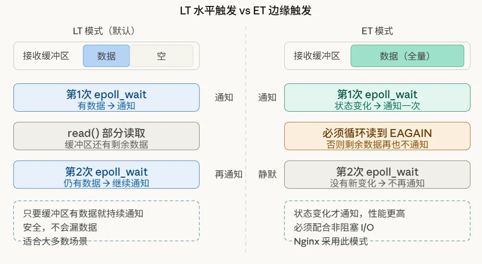 epoll 提供了两种工作模式,这是理解其行为差异和进行性能调优的关键,也是面试中的高频考点。
