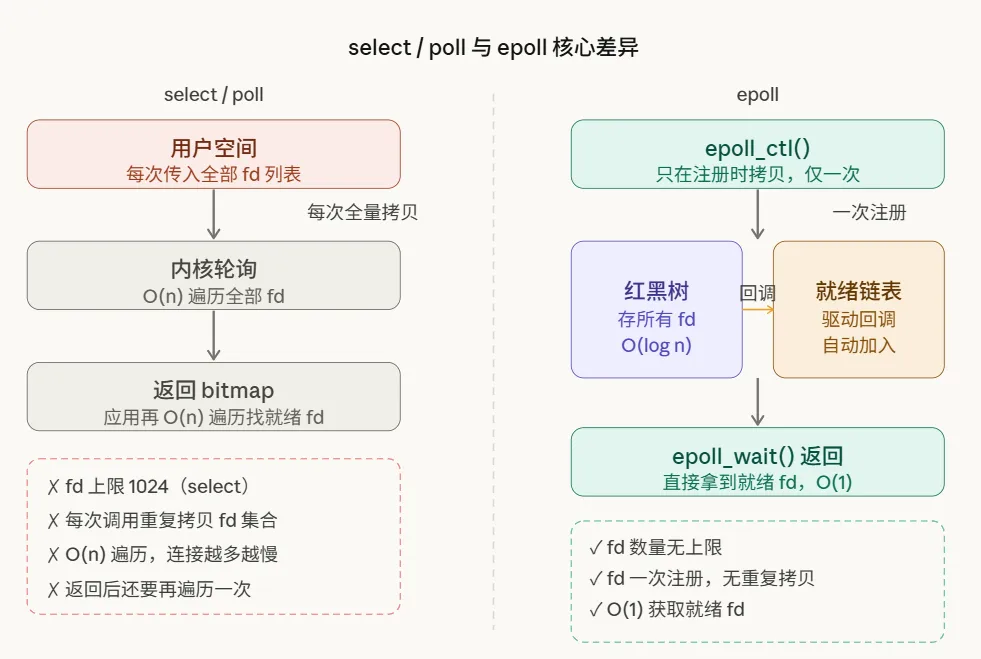 对比一下,select/poll 每次调用都要把全部 fd 列表重新传入内核,是 O(n) 的线性操作,并且伴随着大量的内存拷贝。