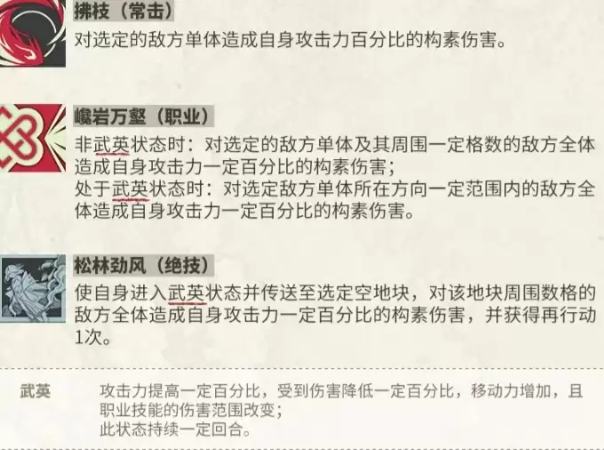 非武英状态时:技能偏向于小范围爆发。它会攻击选定的单体目标,并对其周围一定格子内的所有敌人造成可观的溅射伤害,适合打击扎堆的敌人。