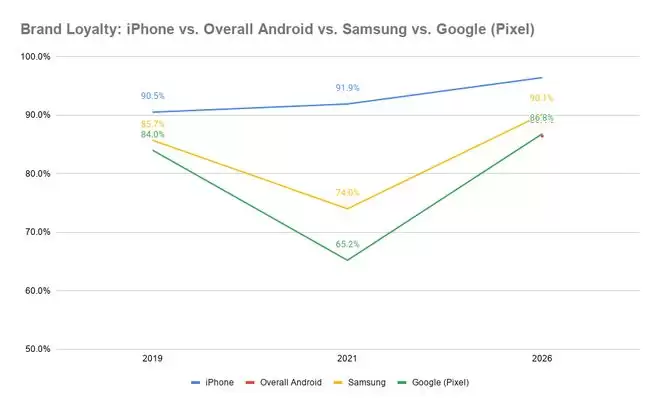 这份报告指出,与五年前相比,两大阵营的用户“黏性”都显著增强。iPhone用户的忠诚度从91.9%攀升至96.4%,而安卓用户的忠诚度提升更为惊人,从65.2%大幅跃升至86.4%。这背后,其实反映了一个市场进入成熟期的典型特征。