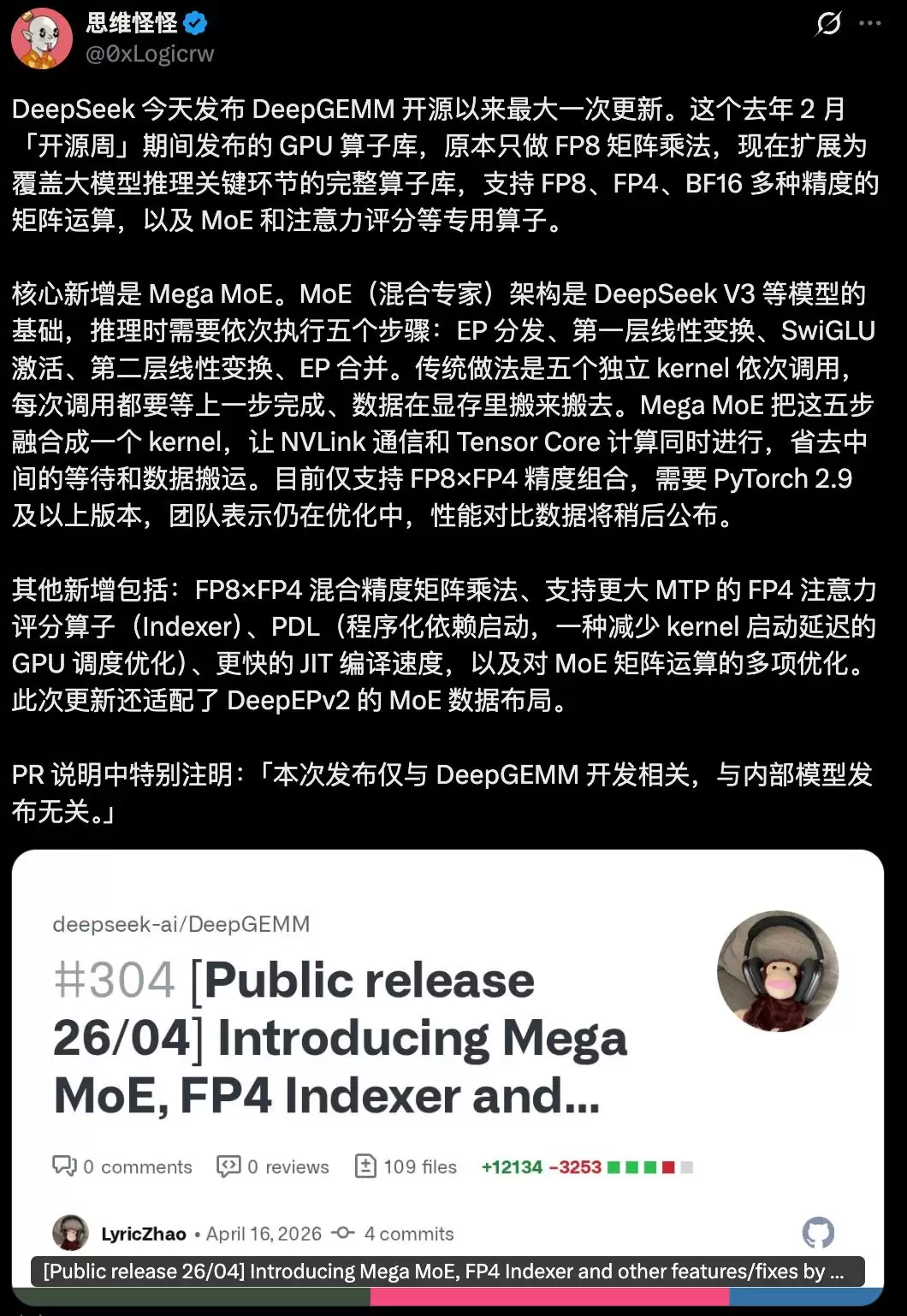 不过,正如官方在PR中特意说明的,这次更新和模型本身无关,重点落在了其底层代码库DeepGEMM上。