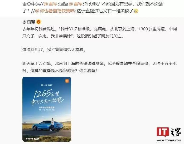 雷军直面小米被黑质疑:直言不会因黑稿噤声,明早将直播SU7续航测试
