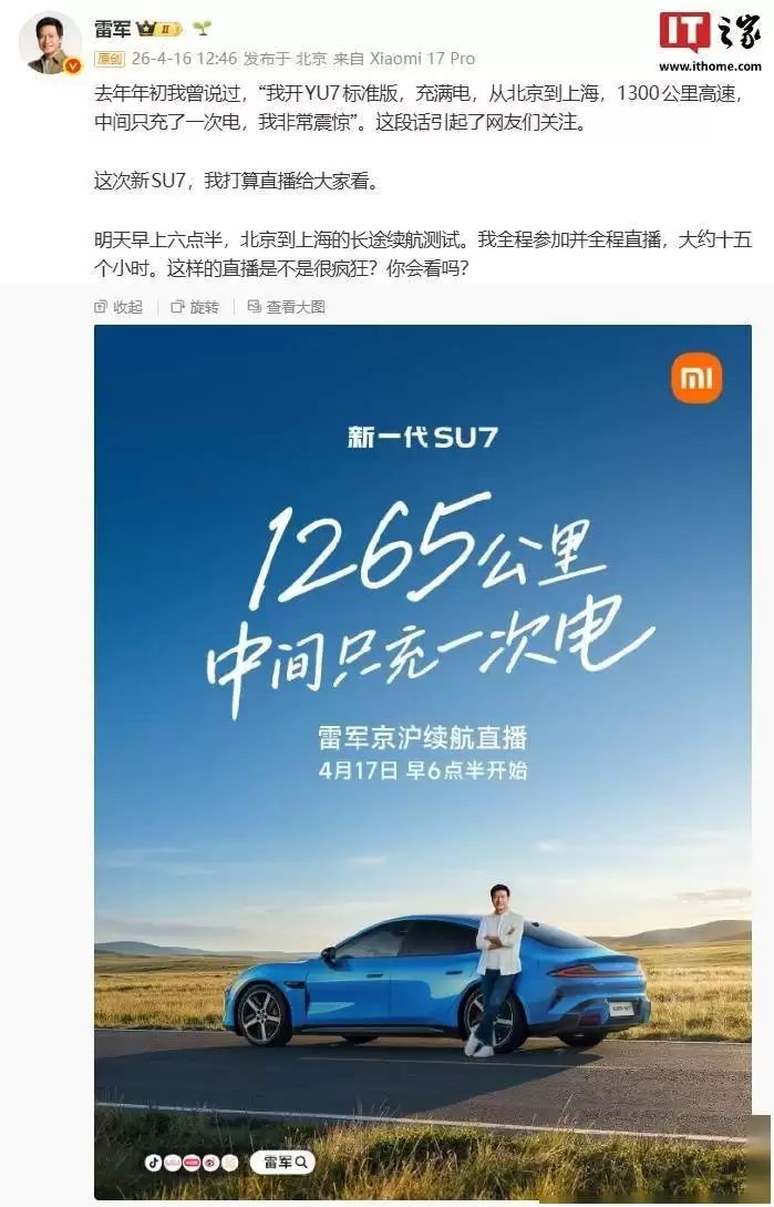 小米的创始人、董事长兼CEO雷军亲自宣布,一场硬核的续航挑战即将上演。就在第二天清晨六点半,新一代小米SU7将从北京出发,一路开往上海,整个过程预计长达十五小时,并且会全程直播。雷军本人也将参与其中。消息一出,立刻在网络上炸开了锅。有人期待,也有人担心:这么高调的直播,会不会反而引来一波负面舆论?对此,雷军的回应很干脆:“不能因为有黑稿就选择沉默。”这话说得直接,也表明了团队直面关注的决心。