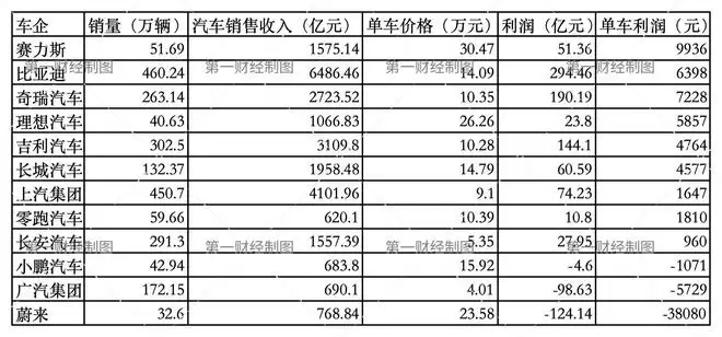 一个直观的感受是:车企之间的盈利水平,差距可不是一星半点。有的已经稳健赚钱,有的仍在为扭亏苦苦挣扎,而即便是盈利的玩家,其单车利润也尚未突破万元大关。