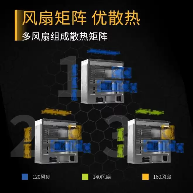 散热设计上,这款机箱可以说做足了功课。顶部、前方、左侧以及后方都配备了大面积的MESH通风网孔,确保气流畅通无阻。具体到风扇位,顶部和前方都能兼容2颗160mm的大尺寸风扇,甚至连左侧上部也预留了一个160mm风扇的安装位,风道构建的潜力很大。至于前置I/O接口,它提供了一个USB-C接口、两个USB-A 5Gbps接口以及一个音频插孔,算是当前的主流配置。