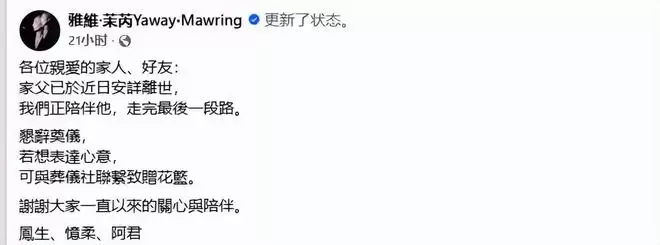 雅维茉芮在讣告中写道:“各位亲爱的家人好友,家父已于近日安详离世,我们正陪伴他走完最后一程路!恳辞奠仪,若想表达心意,可与殡葬联系自赠花篮。谢谢大家一直以来的关心与陪伴!”