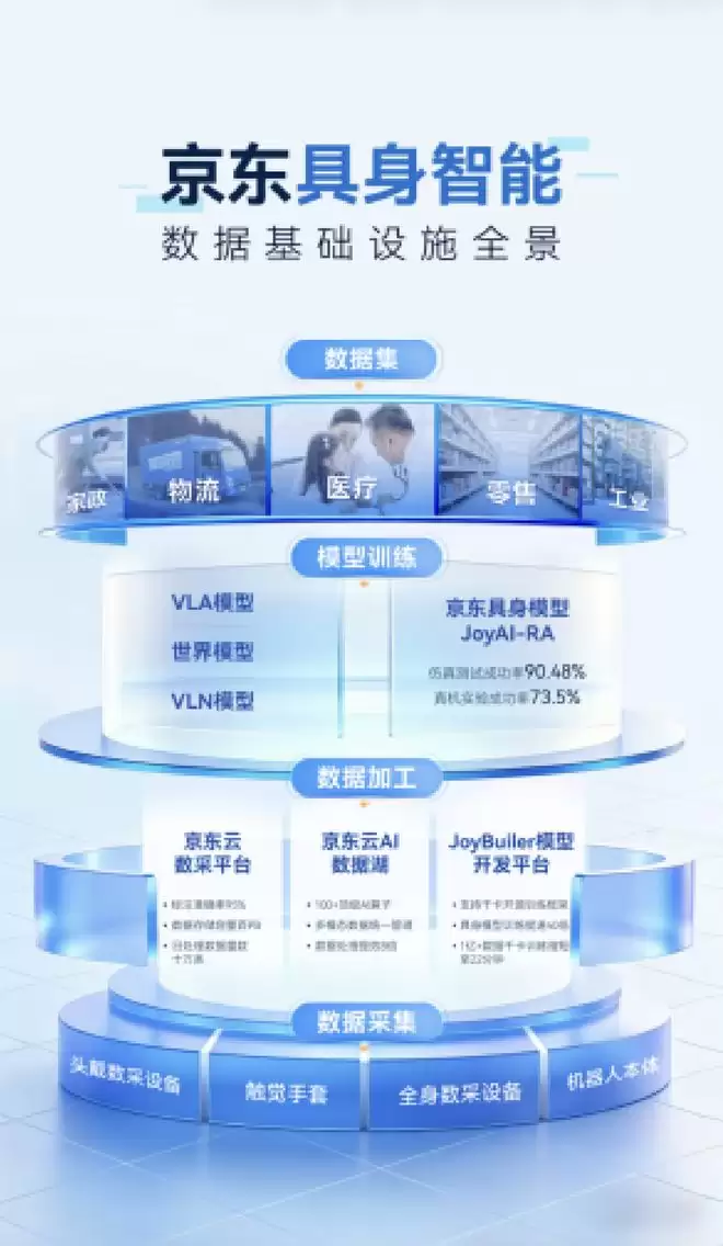 基于对行业痛点的深刻理解,京东选择以构建完整生态的方式切入竞争。近期,他们正式推出了覆盖“数据采集、存储、标注、训练、评估、仿真、测试”全流程的具身智能数据基础设施解决方案。该方案一次性发布了包括自研超高清采集终端JoyEgoCam、具身智能大模型JoyAI-RA在内的系列产品,并同步上线了数据交易平台,首批即定向开放了超过2000小时的高精度标注数据集,旨在降低行业数据获取门槛。