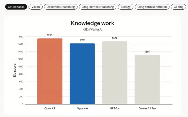 内部测试表明,Opus 4.7在专业领域表现更出色。它像是一位更高效的金融分析师,能够生成严谨的分析模型和更专业的演示文稿,并实现更紧密的任务整合。在第三方评估基准GDPval-AA(涵盖金融、法律等领域的经济价值知识工作)上,Opus 4.7也达到了业界最先进的水平。