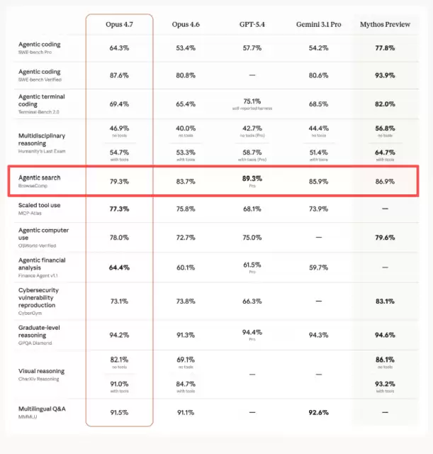 Opus 4.7的联网搜索和智能体能力也出现了轻微下降。其智能搜索评测BrowseComp的分数从Opus 4.6的83.7%降至79.3%,与GPT-5.4(89.3%)的差距被进一步拉大。