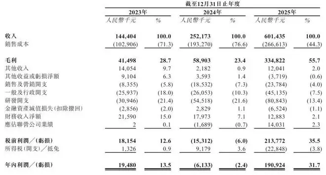 财务数据最能说明增长势头。招股书显示,源杰半导体在2024年、2024年及2025年的营收分别为1.44亿元、2.52亿元和6亿元,呈现跨越式增长。尤其值得注意的是2025年,毛利达到3.35亿元,毛利率跃升至55.7%,盈利能力显著增强。