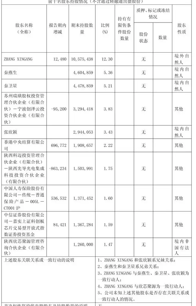 这里有几组关键的一致行动关系:ZHANG XINGANG和张欣颖为兄妹;秦燕生和秦卫星为兄弟;并且,ZHANG XINGANG与秦燕生、秦卫星、张欣颖以及陕西欣芯聚源管理咨询合伙企业构成一致行动人。通过这些关系,ZHANG XINGANG博士合计控制公司约27.76%的股权,是公司的实际控制人。